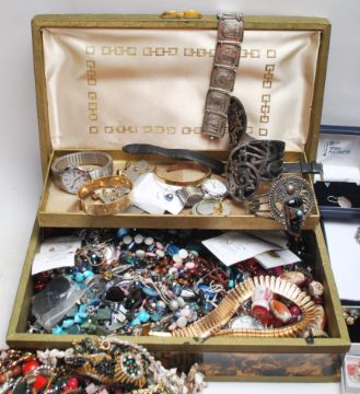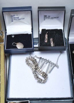 A large collection of costume jewellery. Many items still in the presentation boxes to include Rennie Macintosh collection silver. Also, silver plated and yellow metal wares from Equilibrium. Also 20th century jewellery and other items along with bracelets, watches, bangles, chains and back chains, Concorde items, cuff links and many other items