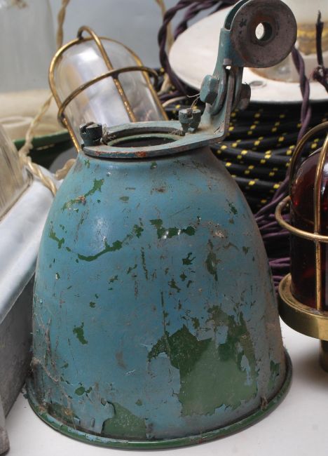 A large collection of vintage lights and lights / lamp fittings to include four Coughtrie Glasgow industrial lights, rope twisted wires, ceramic light fixtures, bakelite light fixtures, brass and glass safely lights, cast iron Crabtree lights switch, etc
