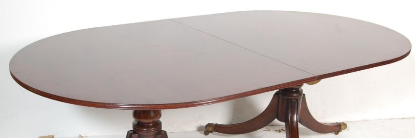 A set of twelve George III style Hepplewhite mahogany dining chairs, by Harrods Knightsbridge London, including four carvers, the shield backs with bifurcated splats and floral surmount, over stuffover seats, raised on moulded square tapered legs united by H-stretchers. Makers label to the frame, together with a Regency style mahogany twin pedestal dining table, fluted sabre legs terminating on lion paw feet with castorsMeasures 75 H x 214 W x 123 D
