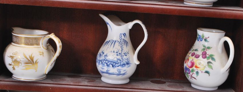 A collection of 12 Royal Worcester replica jugs miniature jugs from the 'Historic Jugs from the Royal Worcester Porcelain Company' collection, to include: Chelsea Ewer, Cabbage Leaf Jug, Silver Shape Jug, Lamprey Cream Jug, Wishbone Jug, Cream Jug, Grainger Jug, Chinese Ewer, Sparrow Beak Jug, Scratchcross Jug, Ring-Neck Jug, Poppy Jug. All having makers mark underside.Measures, 9 cm tall