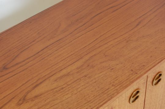 A vintage 1970’s teak Danish inspired low cabinet / cupboard of a rectangular form with twin doors raised on metal hairpin legs Measures 68 H x 91 W x 44 D