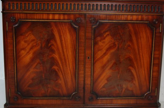 A good quality flame Regency revival mahogany chine / vitrine display cabinet. Raised on bracket feet with twin double door cupboard under a large double astragal glazed door cabinet above. Flared pediment with shaped dentil.