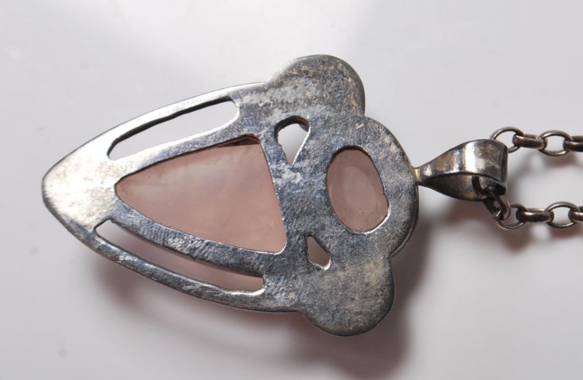 A silver pendant necklace having a pendant set with two rose quartz stones and two pearls in a pierced decoration mount, on a oval link necklace chain. Chain marked sterling. Weight 26.7g. Chain measures 56cm.