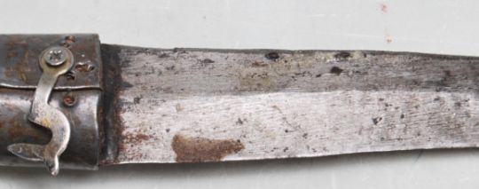 An unusual 20th Century scratch built wooden walking stick with a concealed dagger to the handle, the wooden shaft having carved decoration. Measures, 74 cm Long
