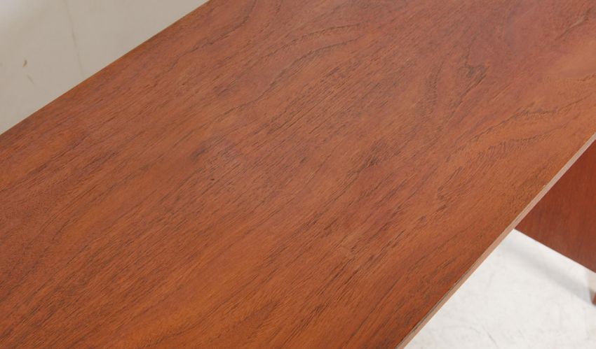 A vintage retro 20th Century teak wood dressing table having a central knee recess flanked by two pairs of drawers with lipped handles raised on block supports united by stretchers, mirror atop.