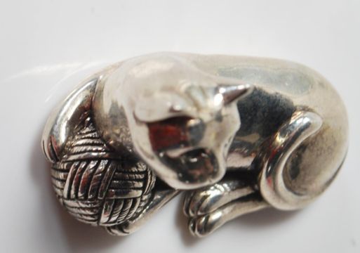 A silver figurine in the form of a recumbent car with a ball of yarn set with round green stone eyes. Marked sterling to the base. Weight 18.2g. Measures 2.5cm.