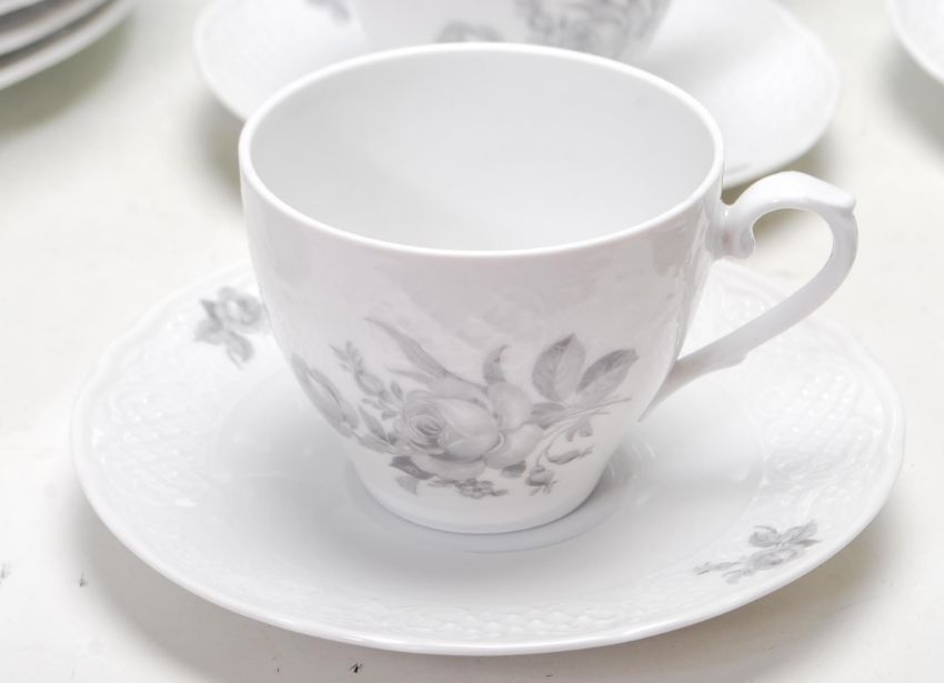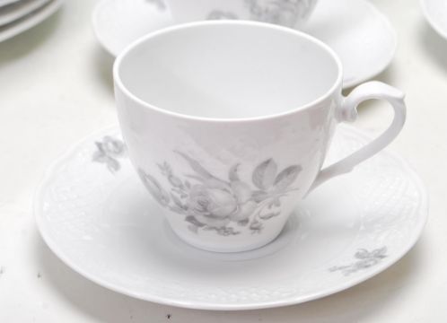 A 20th century Bavaria - German porcelain tea service / set. Fine porcelain decorated with delicate roses in a monochrome colourway. To include cups, saucers, plates etc. Stamped to the underside for Bavaria - Schumann Arzberg