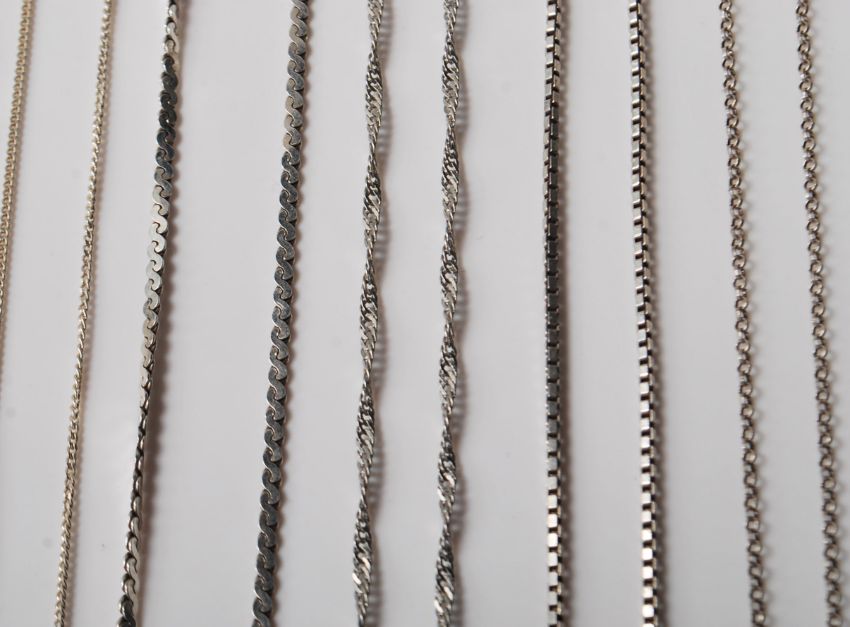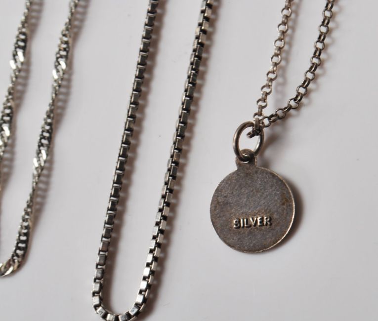 A collection of vintage stamped .925 silver necklaces to include a cable link chain necklace, snake chain necklace with folded circular pendant with a lobster clasp and more.  Gross weight 77.4g.