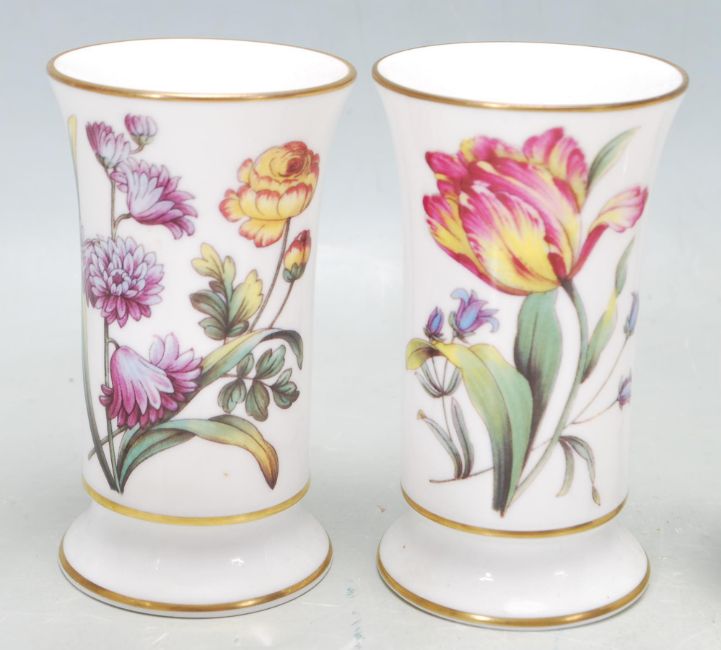 A collection of twelve Compton and Woodhouse Spode fine bone ceramic miniature vases to include floral decoration as Convolvulus, Peony, Pink Wild Rose, Ranunculus, Pink Rose and Pimpernel, Yellow Wild Rose, Campanula, Pink Anemone, Double Scilla, Pink and Yellow Tulip, Red Poppy, Purple Tulip. All with makers stamp underside.Measures, 10 cm tall