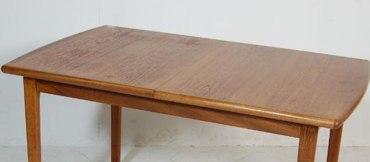 A retro 20th century teak wood Danish inspired rectangular extending dining table having a fold-in leaf raised on shaped supports.Measures  75 H x 132 W x 84 D