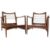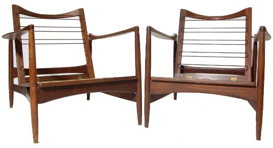 A pair of retro vintage Danish inspired teak wood arm / easy / library chairs having shaped armrests over a seat with webbing supports raised on circular tapering legs. Chairs are without cushions.
