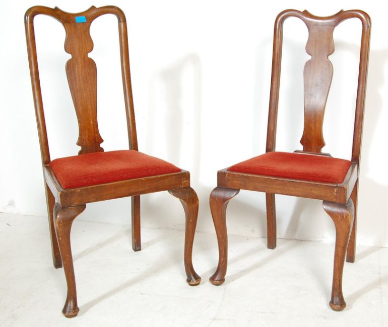 A long run / harlequin set of 9 Edwardian / 1920's Queen Anne mahogany dining chairs.  Raised on cabriole legs with pad feet having drop in seat cushions beneath tall back rests with central Queen Anne back splats of similar style. All with matching drop in seat upholstery. Measures 105 H x 42 W x 51 D