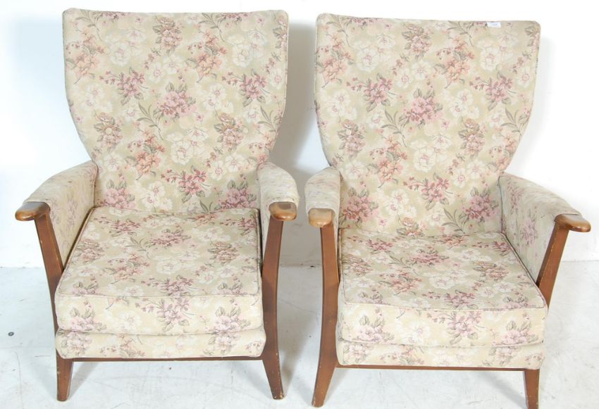 A pair of mid 20th century 1950s Parker Knoll style teak wood chairs having shaped armed rests with show wood frames raised on tapering legs upholstered in floral fabric.Measures 88 H x 66 W x 79 D