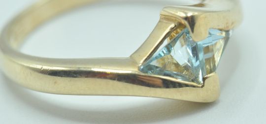 A hallmarked 9ct gold cross over ring set with two triangle cut blue topaz stones. Assay marked Edinburgh. Weight 3.1g. Size M.5.