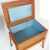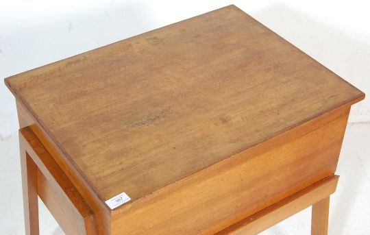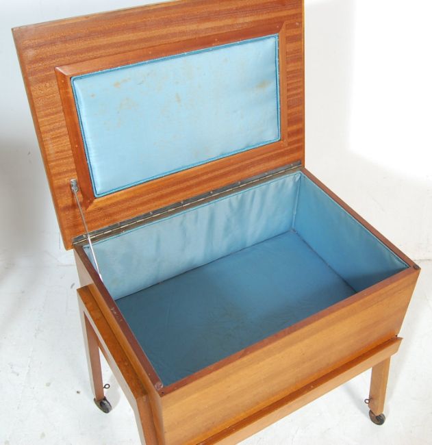 A retro vintage 1960s Danish inspired teak wood sewing trolley having a hinged lid opening to reveal a spacious interior raised on angular tapering legs set on castors. Measures  60 H x 60 W x 44 D