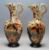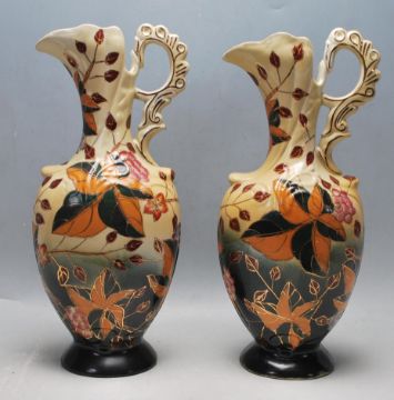 A large pair of antique early 20th century porcelain vases having hand painted polychrome and gilt tube lined foliate decoration with moulded handles to the neck. Measures, 40 cm tall