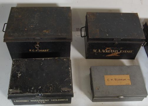 A collection of vintage 19th and 20th century deed boxes - bank vault storage boxes in grey and black colourway. Some with notation to include MA Ackland Estate, FC Scott Ltd, Thos Bennett & Sons,  FC Hart etc.Measures  30 H x 46 W x 32 D
