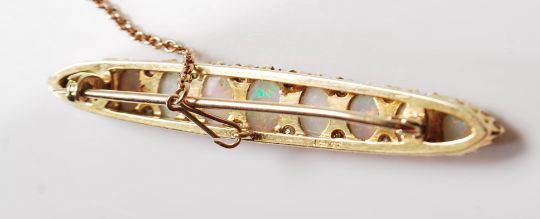 A 19th Century Victorian 15ct gold opal and diamond brooch having nine oval opal cabochons set with diamond accent stones, with hinge pin to verso and fine safety chain. Marked 15ct to verso. Weight 6.7g. Measures 5.5cm wide.