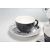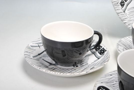 Six vintage retro 1950s Homemaker Pottery dinner plates designed by Enid Seeney and produced by Ridgeway Pottery, Staffordshire. Together with two bowls, two side plates, four saucers, three teacups and a creamer jug. The set features a black and white monochrome pattern depicting contemporary furniture and other domestic objects in an illustrative style. Makers marks to the base. Dinner plates measure 25cm in diameter.
