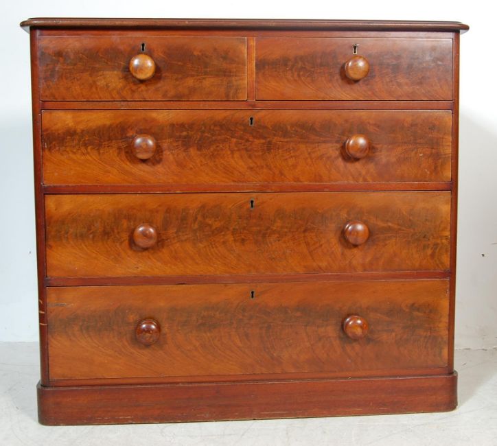 A Victorian 19th century mahogany 2 over 3 chest of drawers being raised on a plinth base with 2 short over 3 deep drawer having knob handles to the drawers