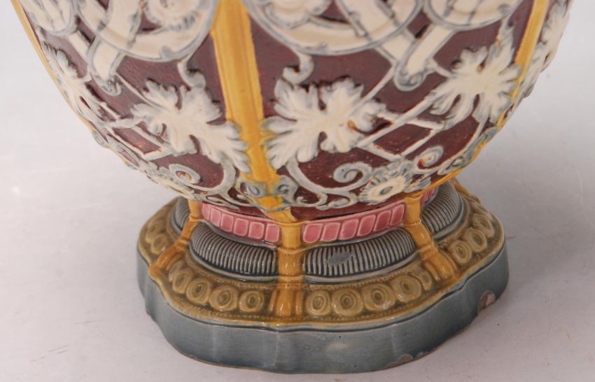 A 19th Century Victorian Copeland Majolica twin handled vase having moulded raised mask and foliate decoration, with moulded scrolled handles and borders. AF, damage to the neck. Measures 40cm tall.