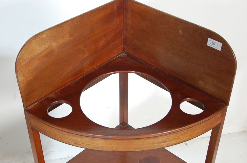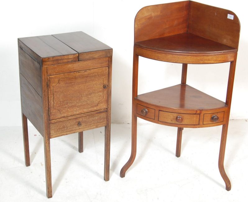 A 19th century George III mahogany washstand of pedestal form having a fold over top being raised on squared legs Together with a bow front corner washstand with drawers to the lower frieze. The top with gallery splash back and central bowl recess