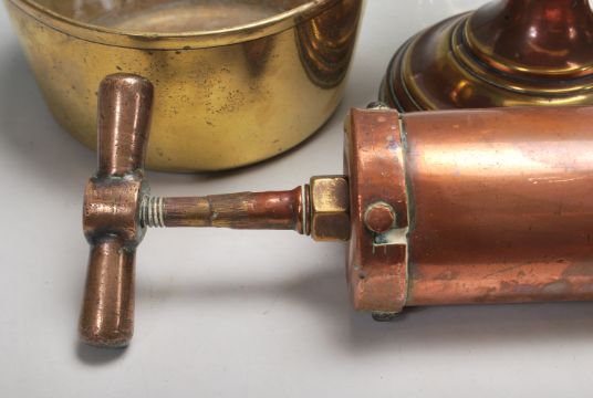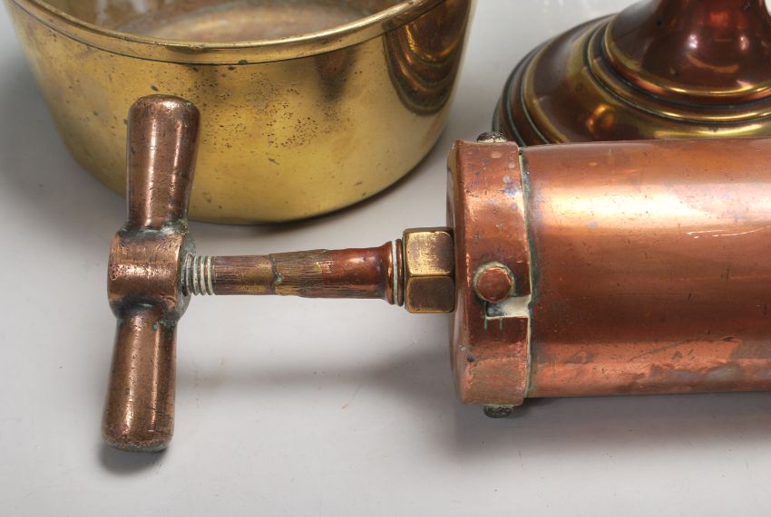 A collection of Victorian and later copper and brass wares to include a large copper fire extinguisher. large copper Victorian stove kettle and lid, copper oil lamp, copper kidney shaped dish and an Indian brass chase decorated plant pot.
