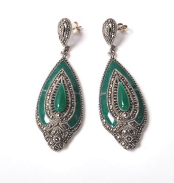 A pair of vintage mid 20th Century ladies silver drop earrings having green enamelled panels and set with marcasite's throughout. Marked 925 to verso. Drops measure 2.5 inches.