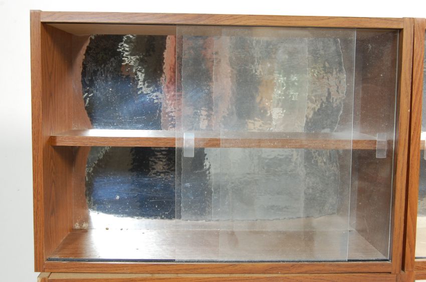 A set of 12 retro vintage industrial pharmaceutical opticians mirror backed shop display point of sale cupboards of rectangular form with sliding glazed doors. Together with two smaller shelving unitsMeasures 32 H x 47 W x 17 D