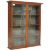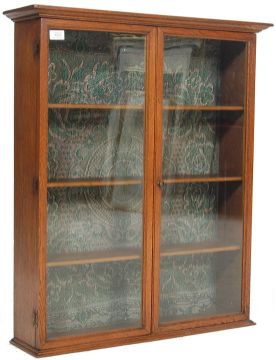 A good early 20th century Edwardian oak table top display cabinet / wall hanging cabinet bookcase having glazed doors, three fixed shelves and fabric back panel.Measures 82 H x 71 W x 18 D