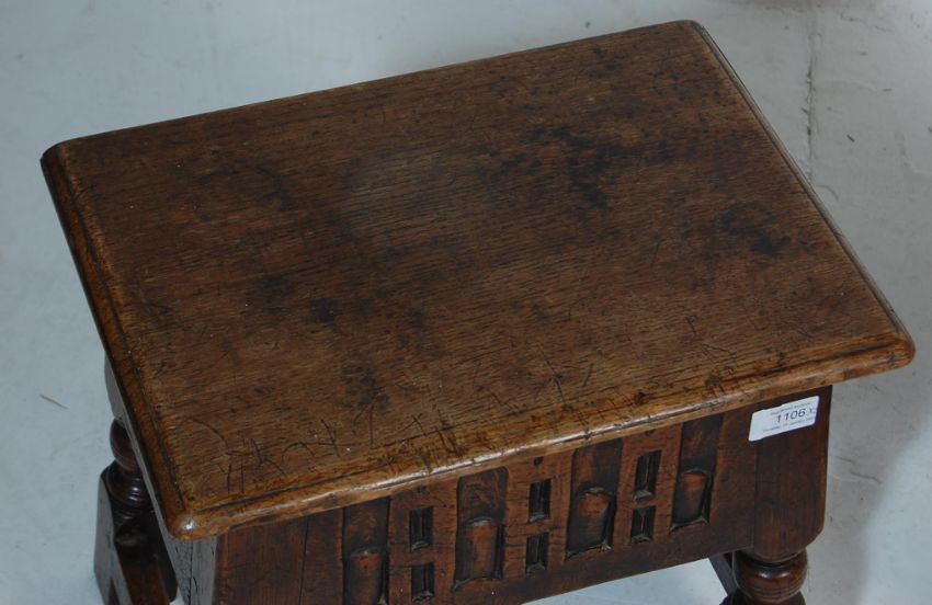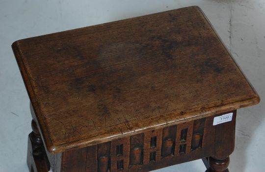 A peg jointed 16th century revival hinge top stool / bible box of rectangular form with hinged lid, carved panels and block feet united by stretchers, along with a Regency mahogany and leather piano stool with adjustable circular seat, hexagonal column and splayed legs.