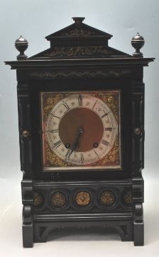 A late 19th / early 20th century German architectural oak ebonised mahogany cased bracket clock. The clock fitted with a German striking 8 day movement stamped for Lenzkirch. The case with gilded features having silvered chapter ring and roman numerals with facet hands. Measures 44 cm high.
