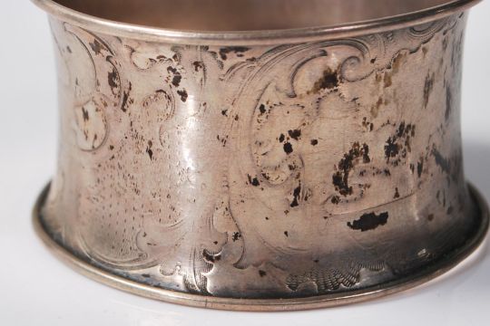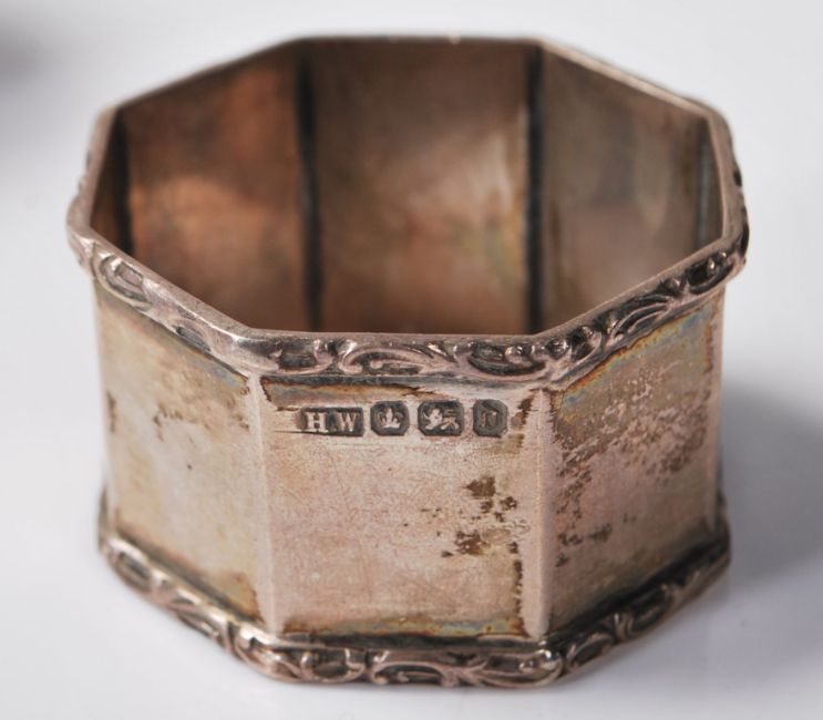 A group of three silver napkin rings to include a pair of 19th century German silver napkin rings with raised decoration of a castle to the sides (quite rubbed, marked 13 to the side) together with a silver hallmarked Victorian octagonal napkin ring engraved with initials R.V (hallmarked Sheffield 1896). Total weight 73.g.