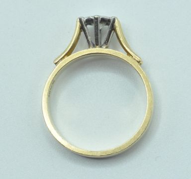 A stamped 18ct gold and diamond solitaire ring set with a brilliant cut diamond elevated on prongs with raised shoulders. Stamped 18ct. Diamond estimated 22 pts. Weight 5.0g. Size O.