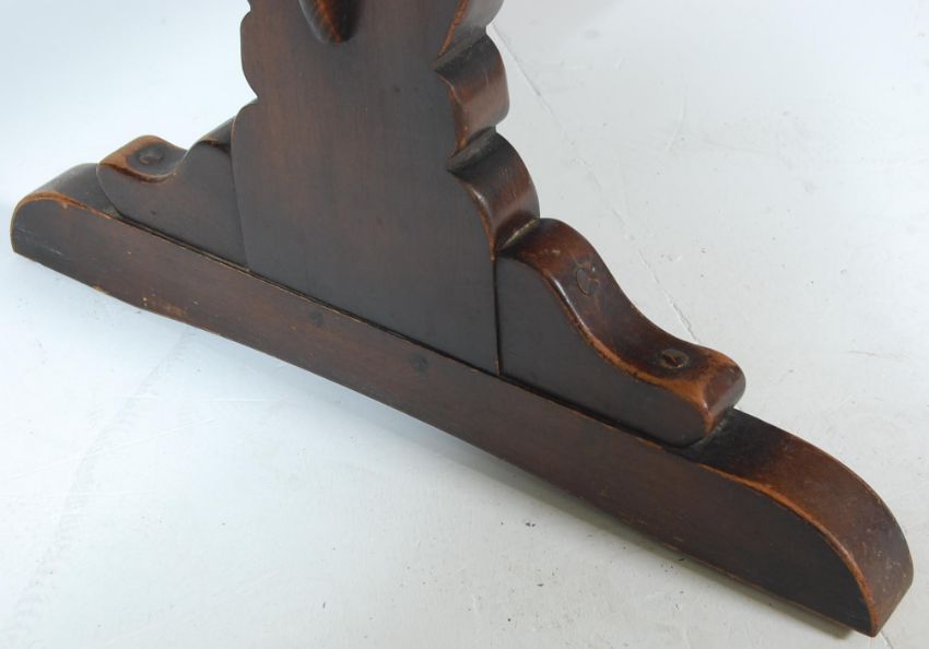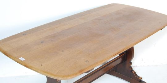 A vintage 20th Century Ercol Old Colonial oak dark wood refectory dining table raised on Windsor supports united by a single stretcher having carved detailing.Measures  72 H x 153 W x 75 D