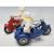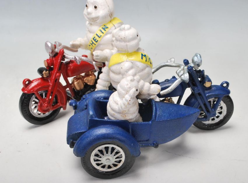 Two vintage style cast iron Michelin figurine comprising of the iconic Bibendum / Michelin Man riding a red motorcycle together with another Bibendum / Michelin Man riding a blue motorcycle with a sidecarMeasures, 4 cm Long