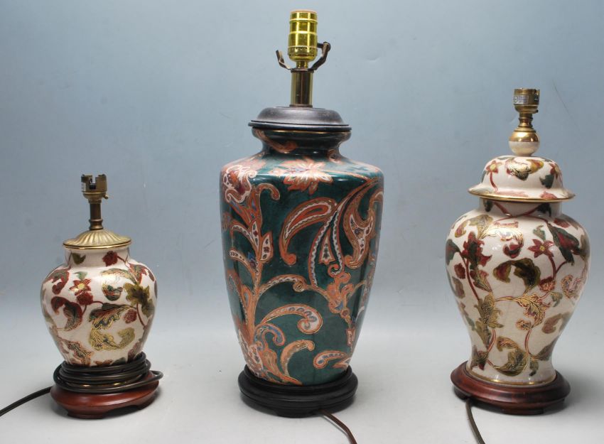 A collection of 20th century Chinese porcelain lamps - famillle rose  / Kutani lamps of baluster form to include 2 matching and one with blue foliate ground