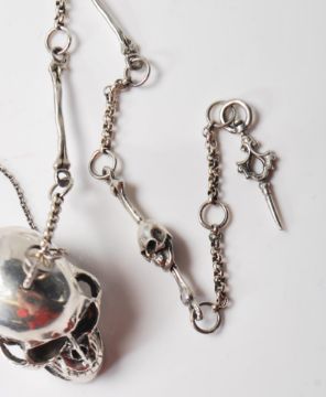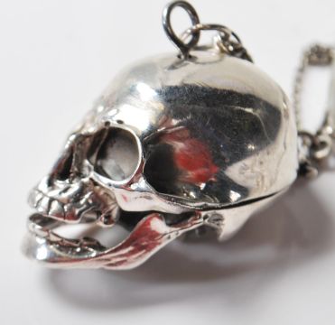 A sterling silver skeleton pocket watch chain having bone spacers with a toggle and articulated skull weight with a hinged jaw. Marked sterling to the inside of skull. Weight 56.4g.