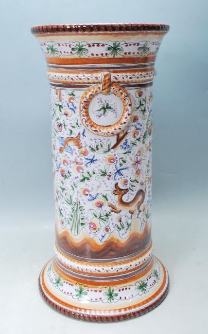 A large 20th century Faience ware cylindrical stick stand vase of pottery form being decorated in polychrome colours and with stamped base
