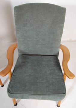 Parker Knoll - A pair of mid century Parker Knoll vintage open framed armchairs / easy chairs. Each raised on show wood open frames with tapering legs and shaped elbow supports. Measures 94 H x 65 W x 66 D