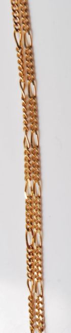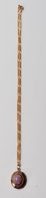 A stamped 375 fine link figaro necklace chain having a 9ct gold pendant set with an opal style stone. Both marked 375. Weight 5.6g.
