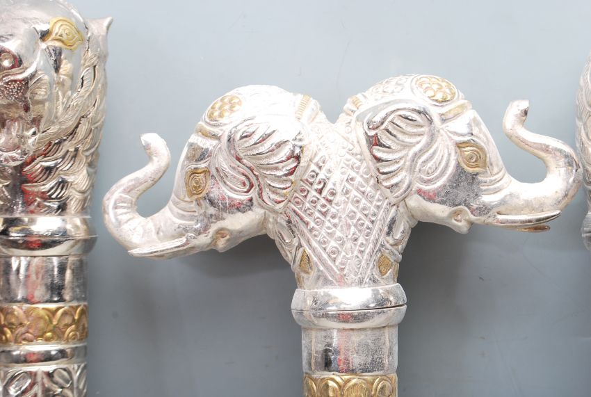 A collection of three vintage 20th century African / Tribal style  metal and brass ceremonial staff ends depicting mirror image elephant and panther heads.Measures, 62 cm Tall