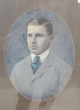 A pair of vintage early 20th century photographic black and white portrait prints, one on fabric.  Both framed and glazed with oval mounts housing images of gentleman in period dress. Measures  60 H x 49 W