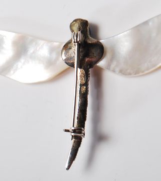 A vintage 20th Century silver and mother of pearl dragon fly brooch set with lapis lazuli cabochon eyes, engraved decoration to the body and engraved details to the wings. Marked 925 to the body. Measures 5.5cm.