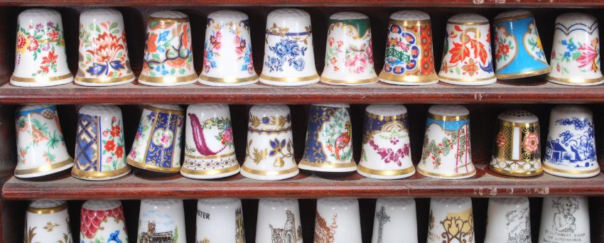 A large collection of vintage ceramic thimbles to include Royal Worcester fine bone china thimbles of various patterns, Cotswold, the natural trust, Royal Crown Derby, etc. Together with a wooden display shelve