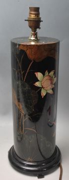 A group of three vintage 20th century table lamps to include antique style wooden cylindrical lamp with hand painted floral decoration on black enamelled background raised on a circular plinth together with gothic style candlesticks converted in a table lamp and a contemporary glass blocks column desk lamp. Measures 60 tall