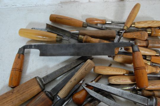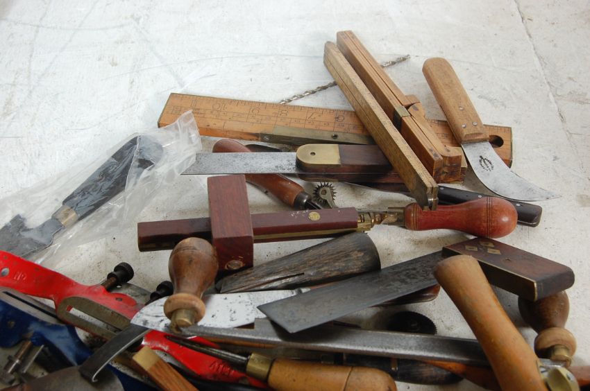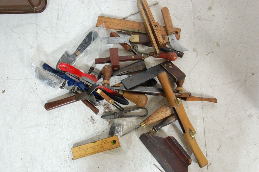 A large collection of vintage tools to include a large quantity of screwdriver of various forms and sizes, wood working tools, various metal hammer for various jobs, wooden hammers, hand drill, woodworking chisels, etc