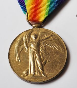 Two WWI First World War Victory medals awarded to: 51291 Private WGS Cowie of the RAF and 10429 Private CJ Galliot of the Somerset Light Infantry - both with ribbons. Along with related military badges including a Sutherland And Argyll cap badge, King's Crown badges and others.