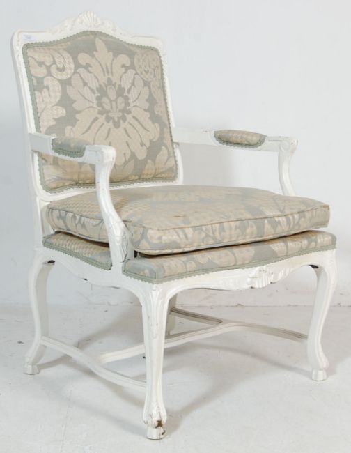 A 19th Century style French fauteuil armchair having a shabby chic painted wooden frame with upholstered backrest, seat and armrest all raised on shaped supports. Measures 98 H x 64 W x  53 D
