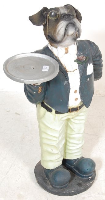 A vintage 20th century shop advertising fibreglass statue of a French bulldog butler holding a circular tray, raised on a plinth base. Measures, 80 cm H x 50 cm D